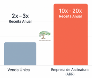 O mercado financeiro desenvolveu um fetiche profundo pelo ARR (Annual Recurring Revenue). Investidores buscam crescimento e previsibilidade. Uma empresa que tem R$ 10 milhões em ARR começa o ano sabendo exatamente quanto vai ganhar. Quem não quer receber uma mensalidade? Como resultado, o Valuation (avaliação de mercado) de empresas de assinatura é significativamente maior.